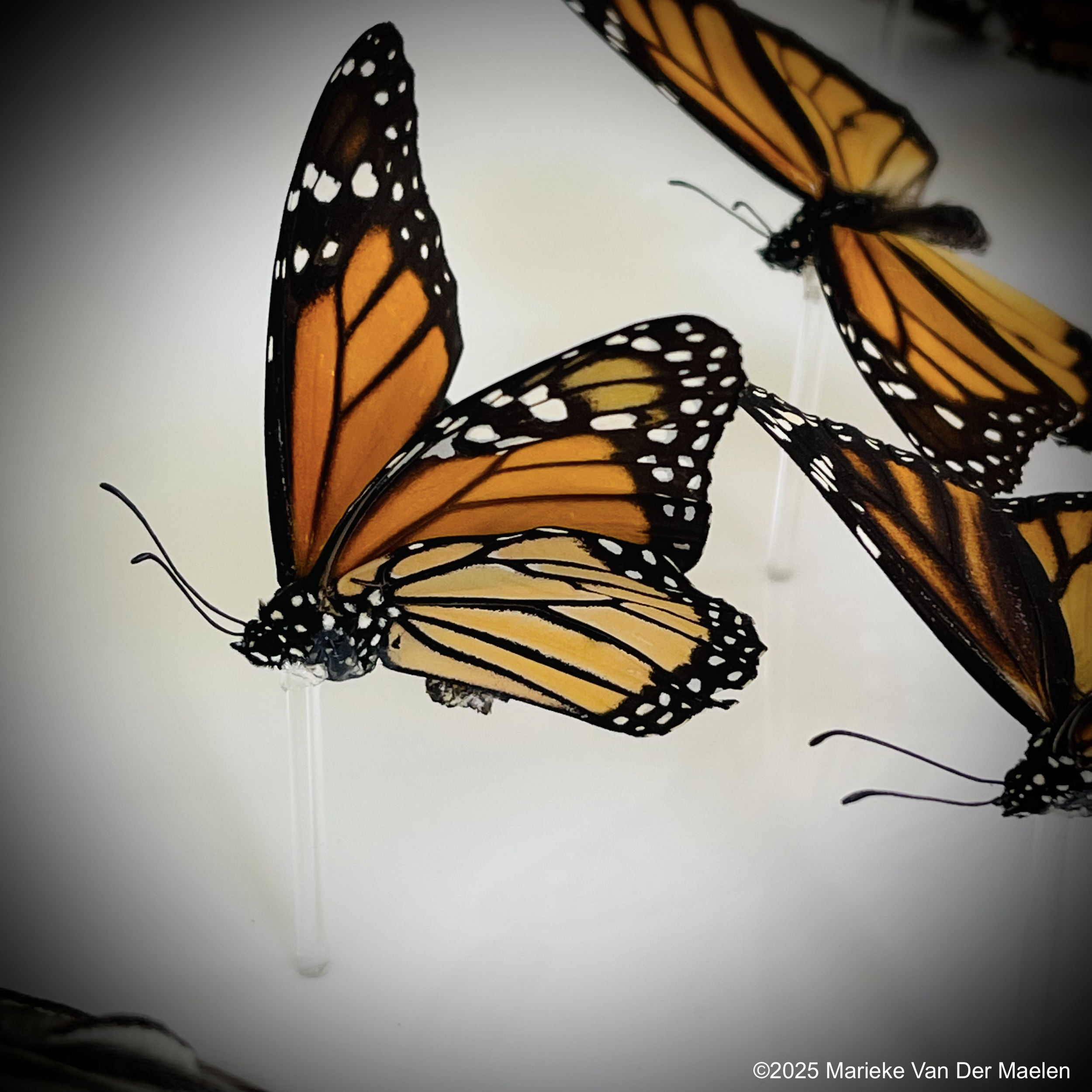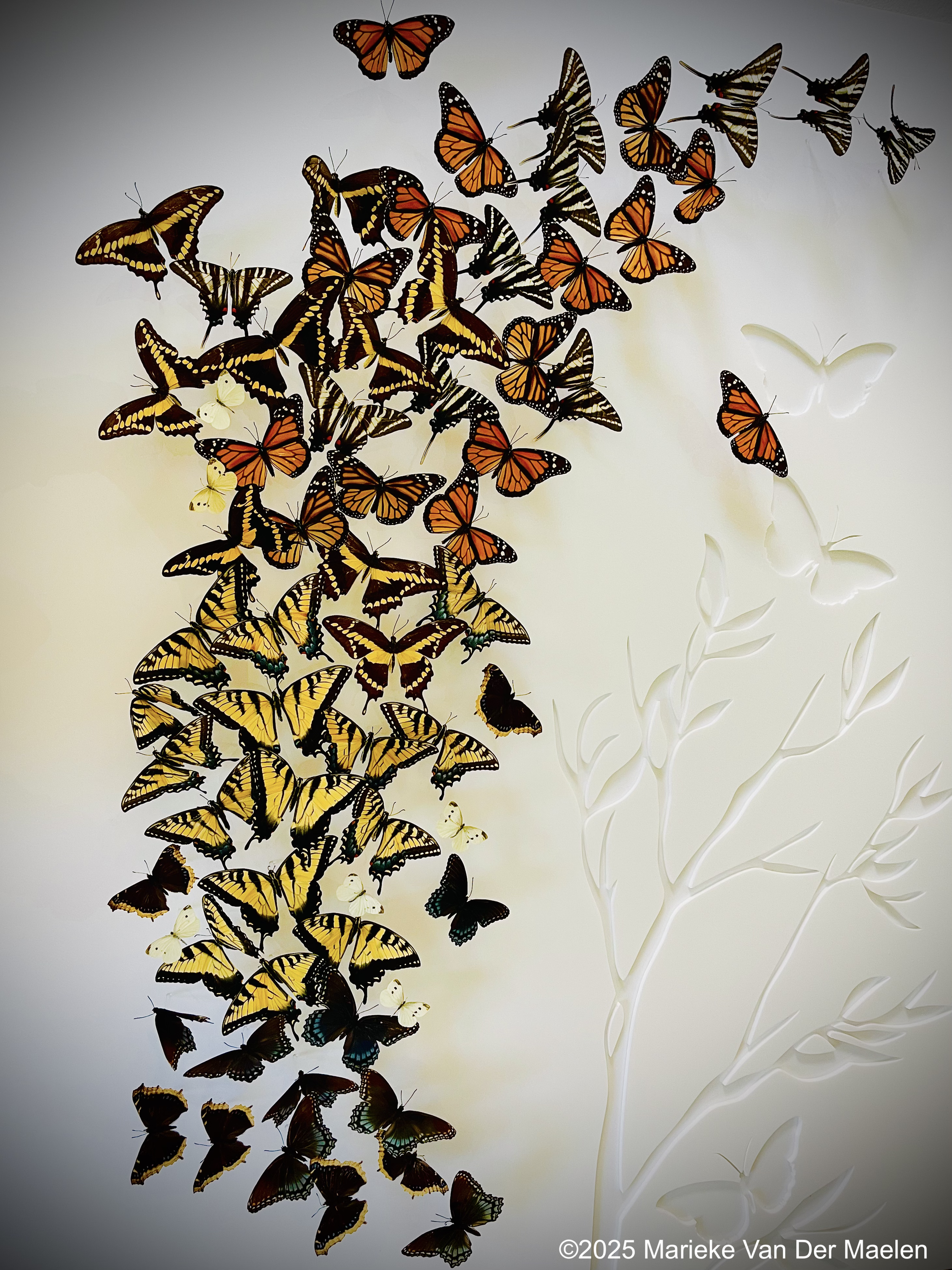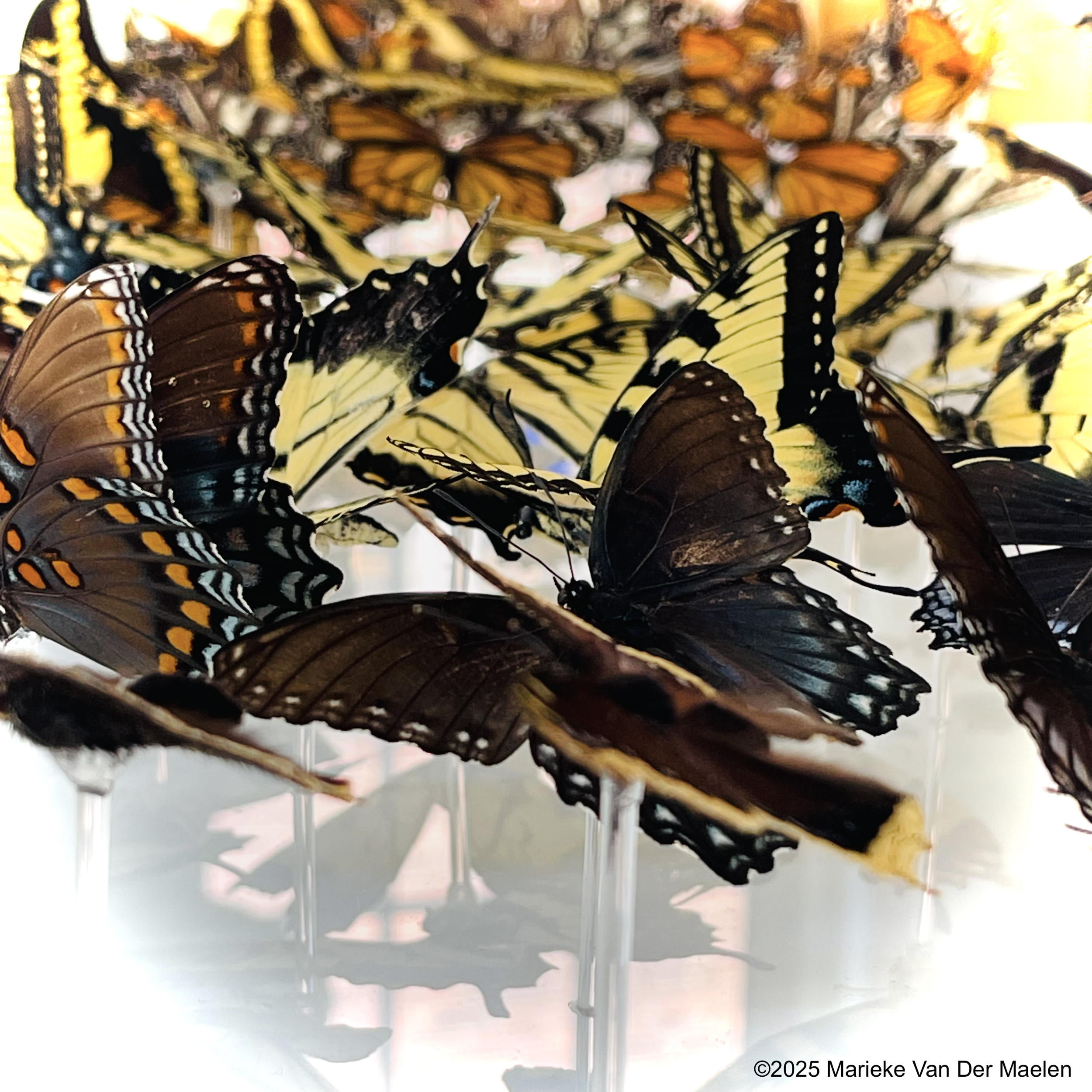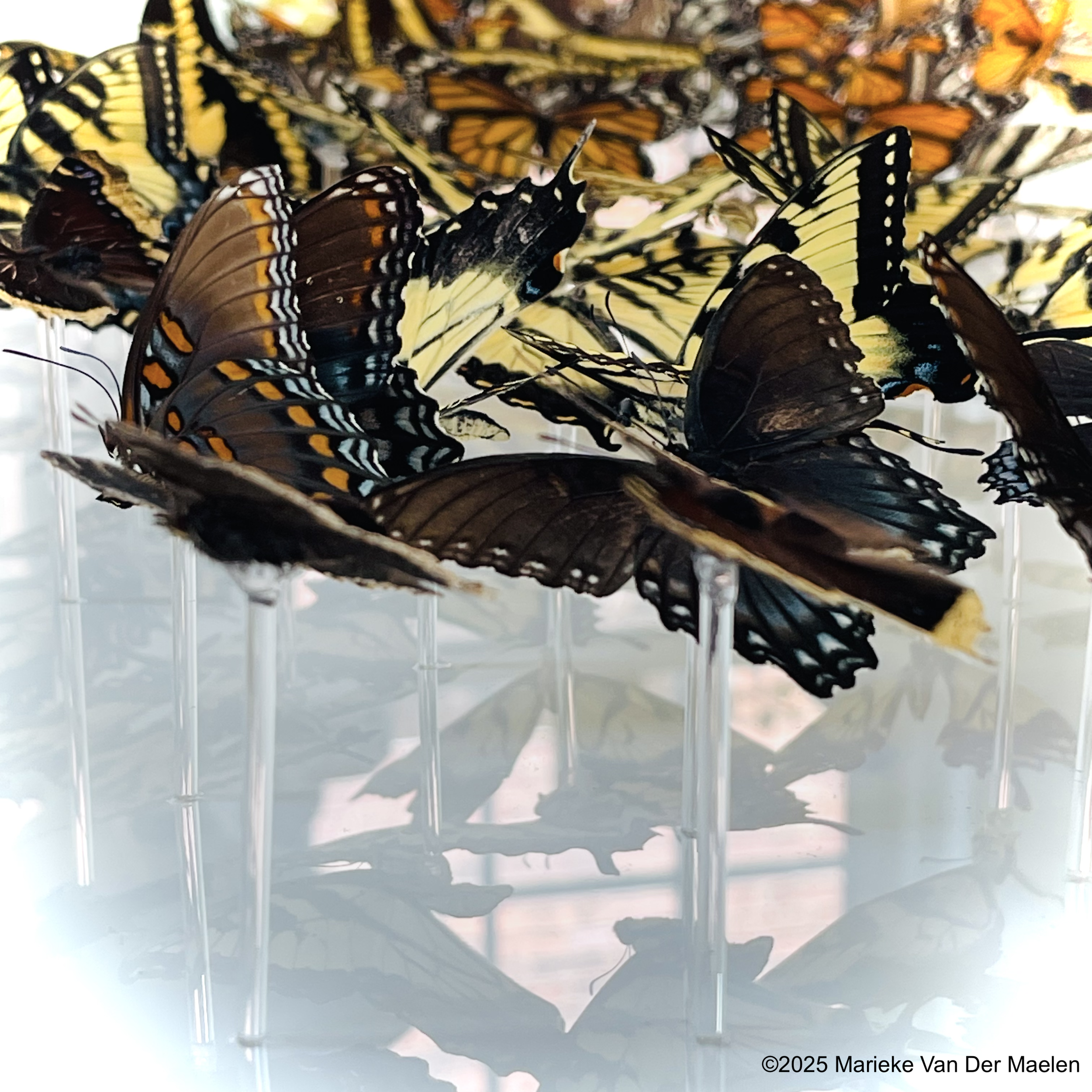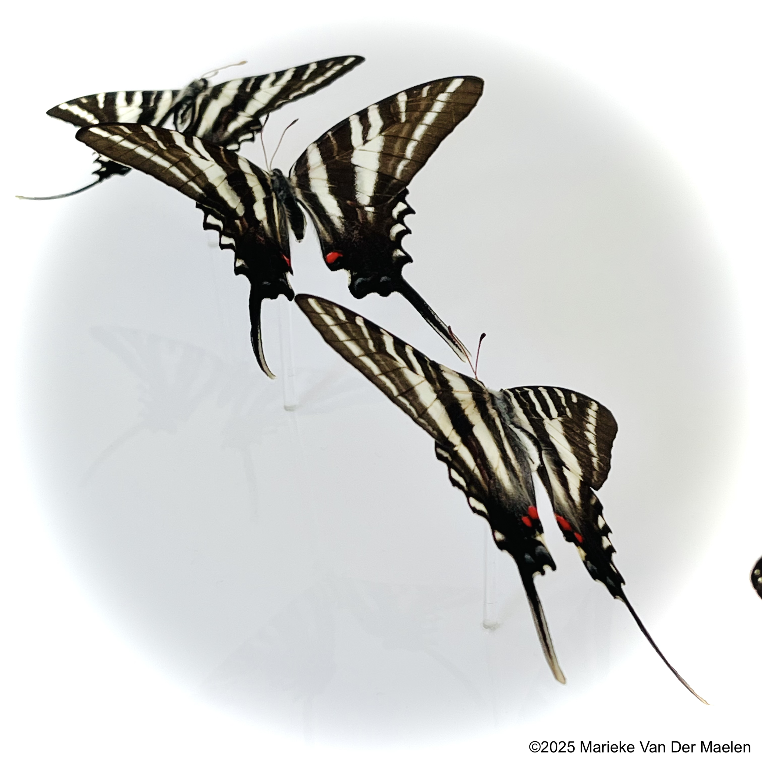 I conduct extensive research on each butterfly species I taxidermy. Each species has unique wing articulation, behaviors, and flight patterns and I want to be able to emulate how they lived in the final art work. My research includes field work, visits to local botanical gardens and butterfly aviaries, and studies of native plants, ecology, and geography.